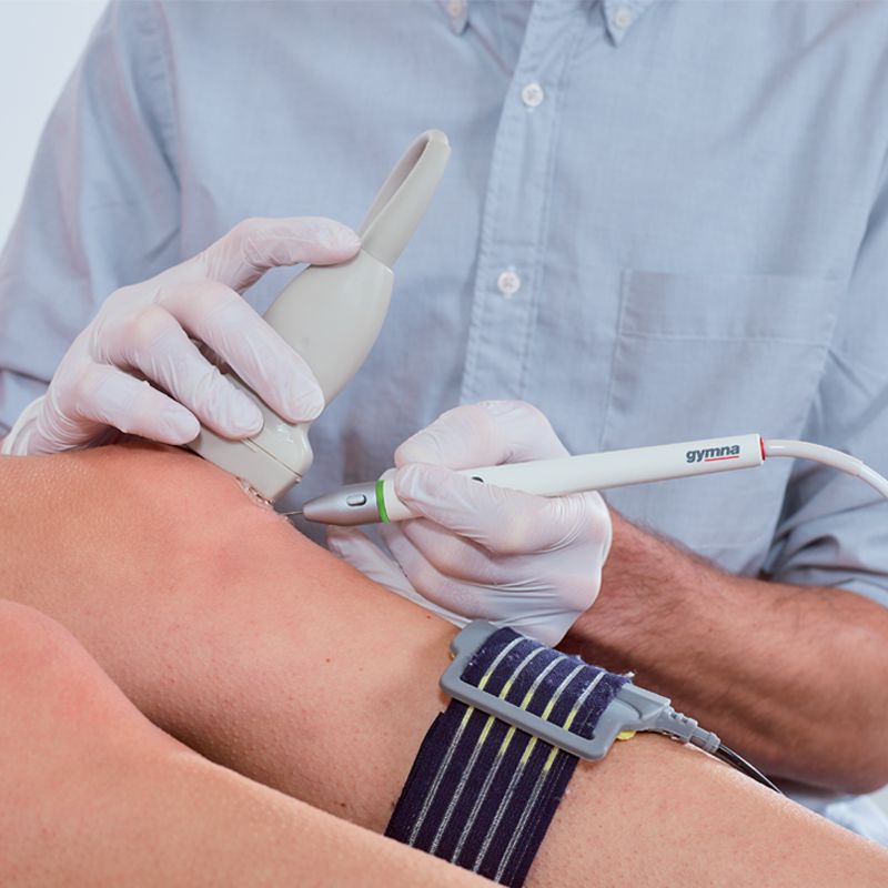 Die ultraschallgesteuerte galvanische Elektrolyse-Therapie (USGET) ist eine Technik, die am häu gsten bei chronisch geschädigtem Gewebe angewandt wird. Durch eine Akupunkturnadel fließt ein galvanischer Strom, der im Gewebe eine Entzündungsreaktion hervorruft. Die Entzündungsreaktion löst im Körper eine Vielzahl von biologischen Prozessen aus. Diese setzen letztendlich die Erzeugung neuer unreifer Kollagenfasern in Gang. Die Fasern werden durch exzentrische Reize gereift.