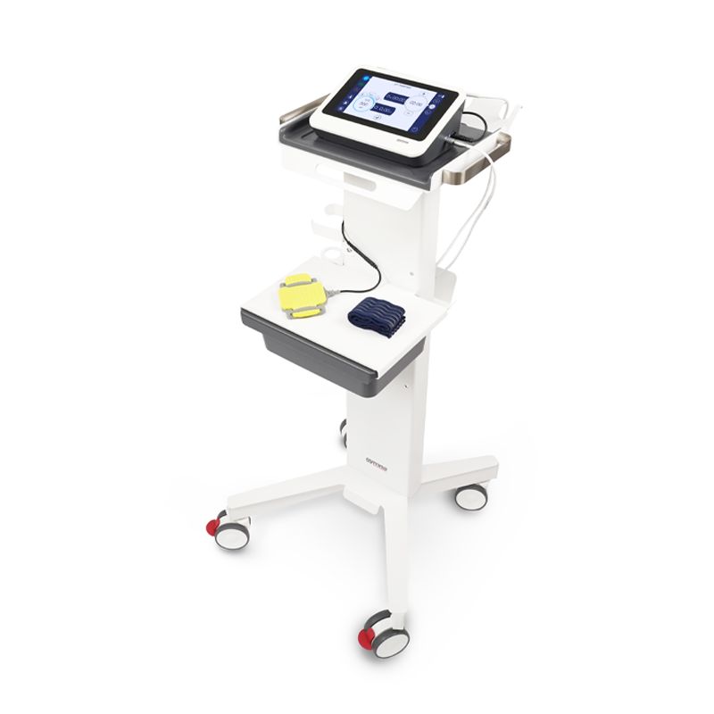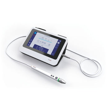 - Handstück mit ausgeklü̈geltem und sicherem Nadelgriffmechanismus, das wie eine kabelgebundene Fernbedienung, zum Starten/Stoppen der Therapie und zum Einstellen der gewünschten Einstellung der Intensität, funktioniert.