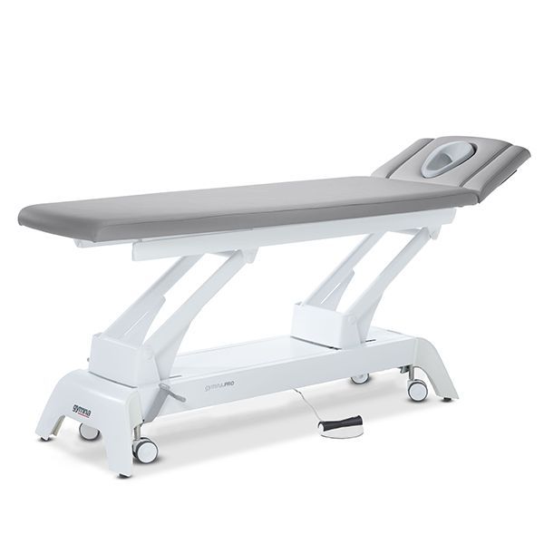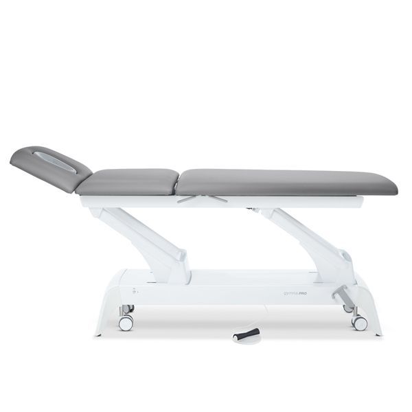 Premium-Behandlungsliege mit 3-teiligem Kopfteil, durchgehender Liegefläche – elektr. Höhenverstellung durch Fußschaltung.