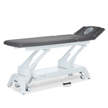 Premium-Behandlungsliege mit 3-teiligem Kopfteil, durchgehender Liegefläche mit seitlichen Armpolstern am Mittelteil – elektr. Höhenverstellung durch Fußschaltung.
