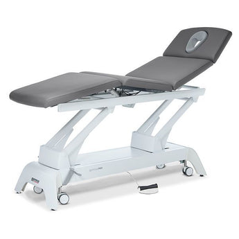 Premium-Behandlungsliege mit 1-teiligem Kopfteil, 3-geteilter Liegefläche – elektr. Höhenverstellung durch Fußschaltung