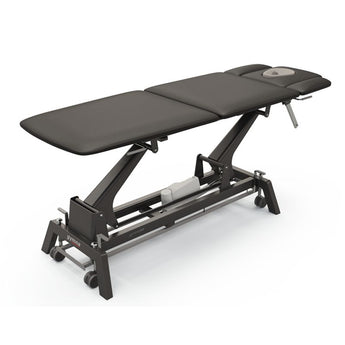 Hochwertiges Sondermodell in Farbe Carbon/Schwarz - Behandlungsliege mit 3-teiligem Kopfteil, 2-geteilter Liegefläche – elektr. Höhenverstellung durch i-Control Rundumschaltung, ErgoMax-Gesichtskissen und Rollen-Hubsystem.