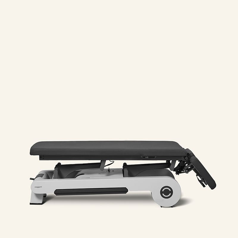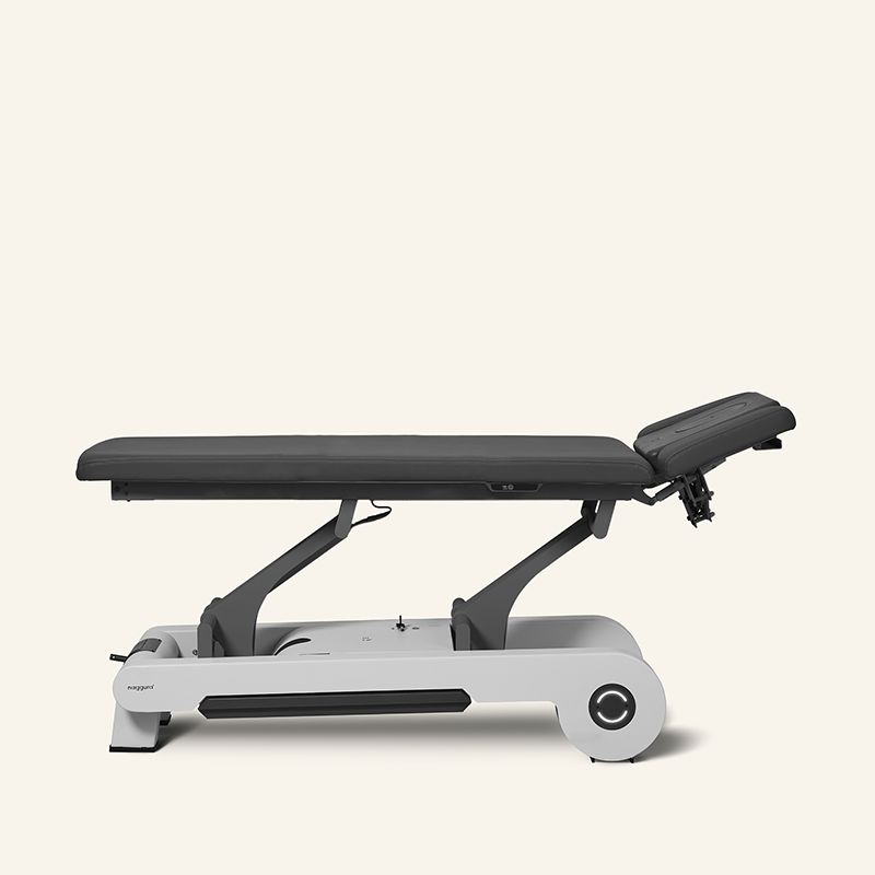 Naggura Topmodell - Behandlungsliege mit 3-teiligem B'Soft-Kopfteil, 1-teiliger Liegefläche mit Premium-Polsterung – elektr. Höhenverstellung durch Rundumschaltung.